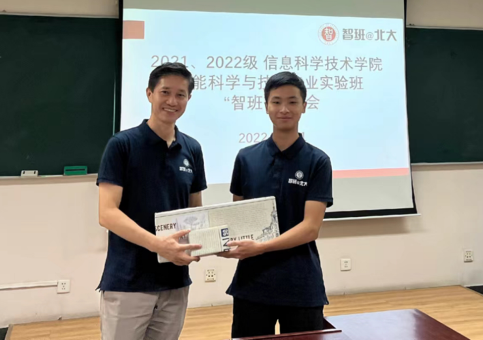 见面会伊始,陈宝权老师将精心准备的礼物颁发给提出智班logo设计构想的王想同学(21级智班),陈老师鼓励智班的同学们启动智慧引擎,不断思索创新,共同为智班的建设贡献力量。