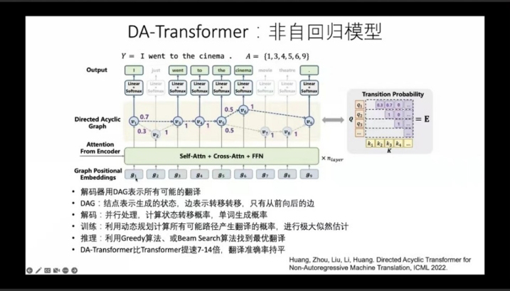 工业界AI Lab在多种形式的数据上都实现了与其相适应的有效的模型,包括非自回归模型DA-Transformer、端到端语音到文本翻译ConST、多颗粒度的视觉语言模型X-VLM、图片和文本统一生成模型DaVinci和语言理解模型Neural Symbolic Processor等。