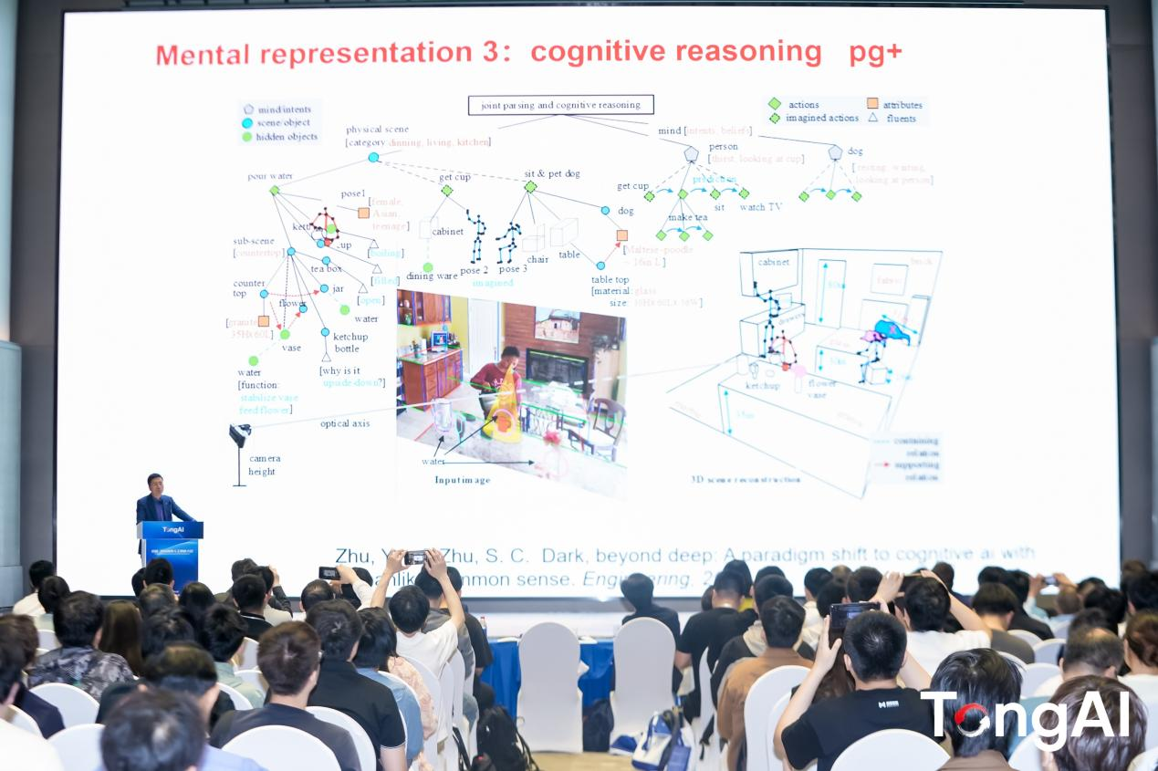 、人工智能研究院院长朱松纯教授出席本次大会并发表主题演讲。他介绍了东方哲学引领下通用人工智能(AGI)研究的最新进展,创新性地提出“基于哲学思想的CUV框架理论”:“C”代表用于思考或模拟大脑中的决策、推理与学习过程的认知架构,“U”代表通用智能体理解环境并与之交互能力的势能函数,“V”即为通用智能体提供动机的价值函数。