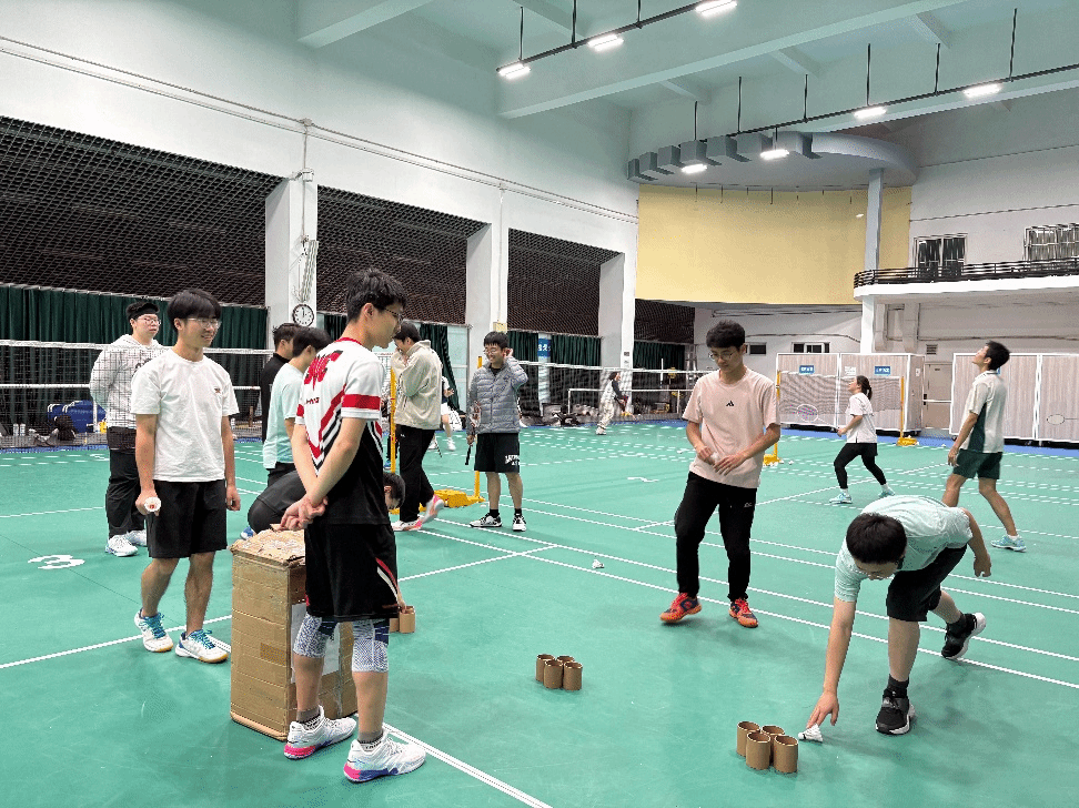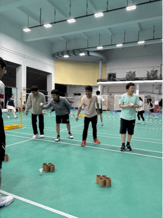本次交流赛以团体赛形式展开,涵盖男单、女单、男双、混双四大竞技项目,更创新加入颠球、羽毛球保龄球、羽毛球投壶三选一趣味赛环节,既考验竞技实力,又充满欢乐氛围。参赛队伍各具特色,队名个性十足 —— 羽濛濛队、摸鱼也要赢队、Crazy diamond 队、智在四方队、娱乐至上队、大运队、呼风唤雨队,每一支队伍都带着满满的自信与期待登场。