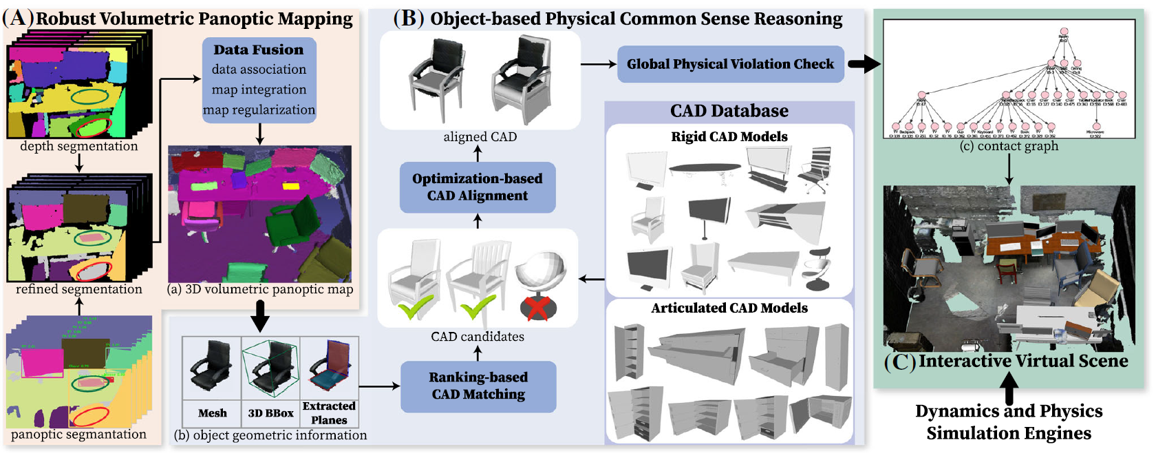 为实现上述的重建任务,论文作者设计并实现了一个多模块的机器视觉系统:一个体积式语义全景建图模块【图4 (A)】,和一个基于物理常识与几何的CAD模型替换推理模块【图4 (B)】。前者被用于鲁棒地在复杂真实环境中借助RGB-D相机识别、分割并重建出物体与房间结构的稠密几何,并估计它们之间的约束关系,以得到如图3 (a) 中的场景图;而后者聚焦于如何根据重建物体的几何特征与识别出的约束关系从CAD模型库中选择最合适的CAD模型,并估计其位姿与尺度,以达到与原物体尽可能准确的对齐,进而生成图3 (b) 所示的可交互的场景图。图5展示了论文作者借助Kinect2相机对真实办公室场景的重建结果,包括体积式全景重建【图5 (a)】、可交互虚拟场景常见【图5 (b) 】以及将虚拟场景导入机器人仿真器后机器人交互的样例【图5 (c)】。我们可以看到,即使在复杂、多遮挡的真实场景中,论文提出的重建系统能较好地建立可交互的虚拟场景。图5 (d-f) 展示了这一实验中的一些有趣的例子:图5 (d) 中,由于椅子对桌子的遮挡,同一个桌子被重建成两个相对短小的桌子;图5 (e) 展示的工位得到了比较高质量的重建,所有的物体都被替换成了外表相近的CAD模型;图5 (f) 中的椅子未能被识别出来,其对后面桌子的遮挡造成了与图5 (d) 相似的情况,而场景中的冰箱与微波炉被重建出来并替换成了多关节、可承载复杂交互的CAD模型。