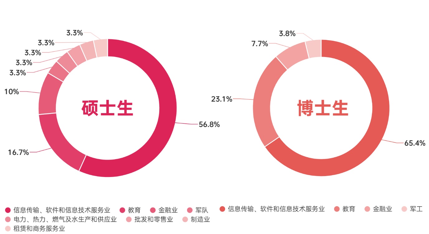 毕业生的综合能力素质。其中信息传输、软件和信息技术服务业人数最多占比60.7%,教育次之占比19.6%,金融业占比8.9%,军工,租赁和商务服务业,制造业等共占比10%。硕士和博士在就业行业分布上较为相似,没有太大差异(见图2)。