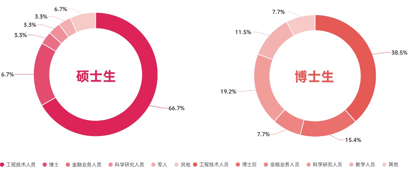 其中,硕士生绝大多数就职工程技术岗位,博士生职位分布更均匀,除工程技术岗位外,也有相当一部分成为金融业务人员、科研人员以及教职人员等(见图5)。
