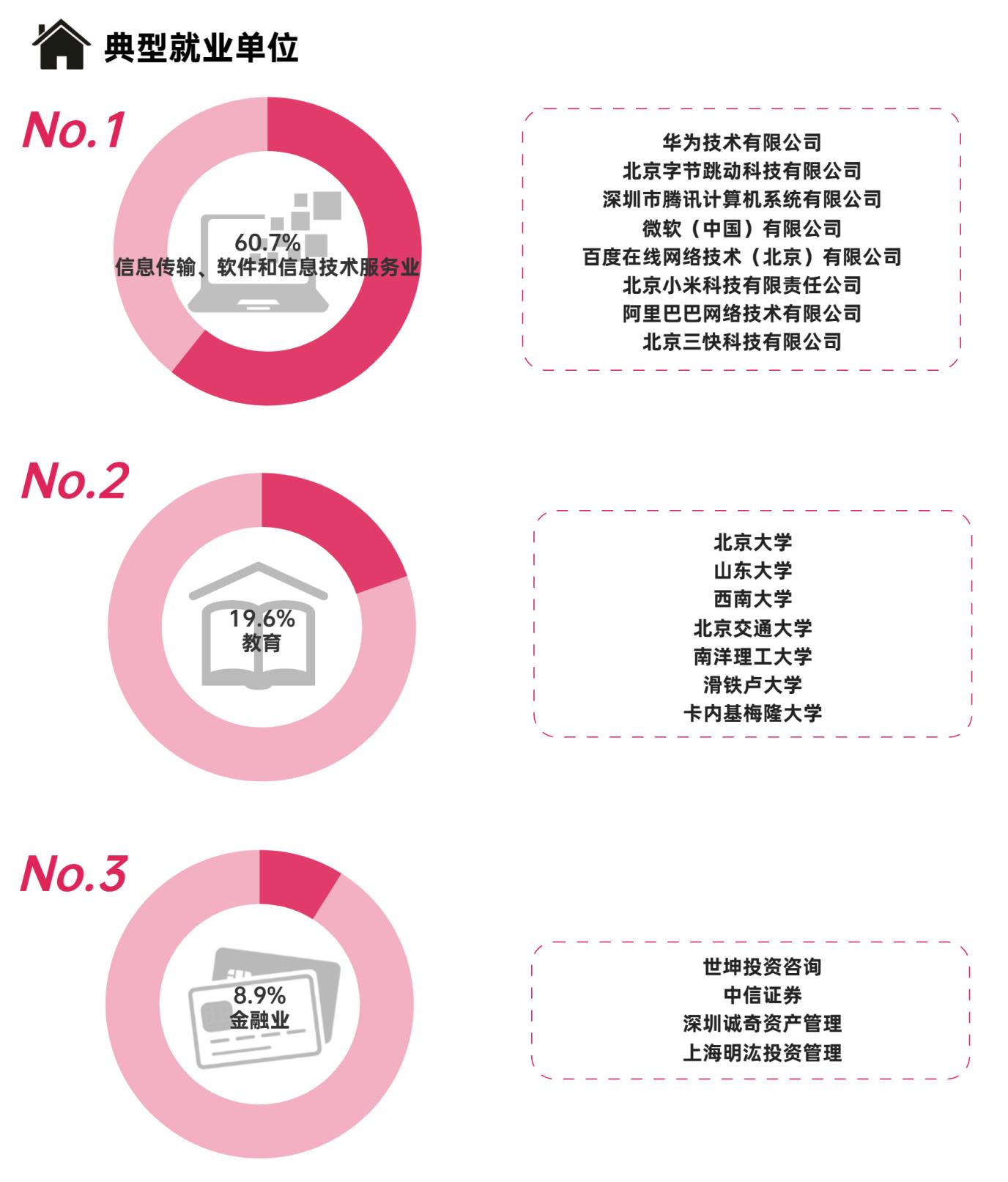 此外,在信息传输、软件和信息技术服务业中,绝大多数毕业生就职于行业顶尖企业,占比较高的用人单位有(见图3):