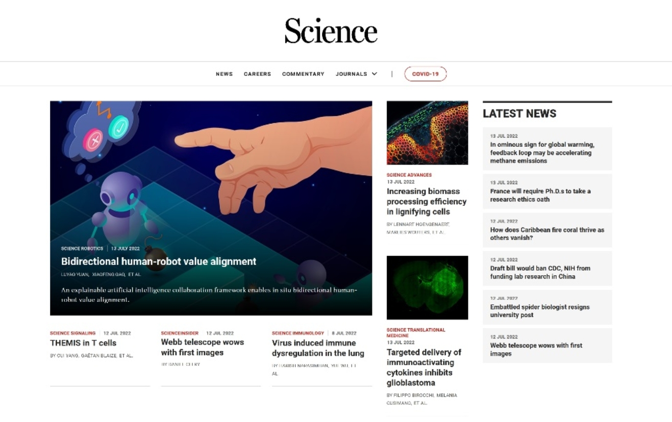 2022年7月14日,Science Robotics发表了来自北京大学人工智能研究院朱松纯教授、朱毅鑫课题组的“In-situ bidirectional human-robotvalue alignment”研究论文,阐述了一种机器实时理解人类价值观的计算框架,并展示了与人类完成的一系列复杂人机协作任务。