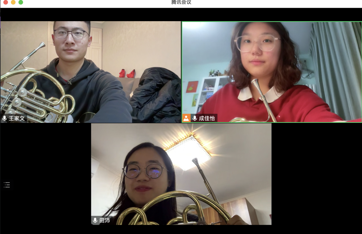 “圆号声部的两位都是第一次接触这个乐器,实际上在刚开始教学时我也有些不知所措。回忆着自己入门时的感受和遇到过的困难,我尽力将自己的经验和体验传递给他们,并在布置的作业和第二次上课中感受到了声部成员们练习的用心。圆号不论入门还是提升都是很有难度的乐器,而成员们进步之快令我十分惊喜。一边感受着乐队同学对于音乐的热爱,一边回想着十余年来学习圆号的点滴,每周与声部成员们共同享受音乐的时光实为难得的经历。”