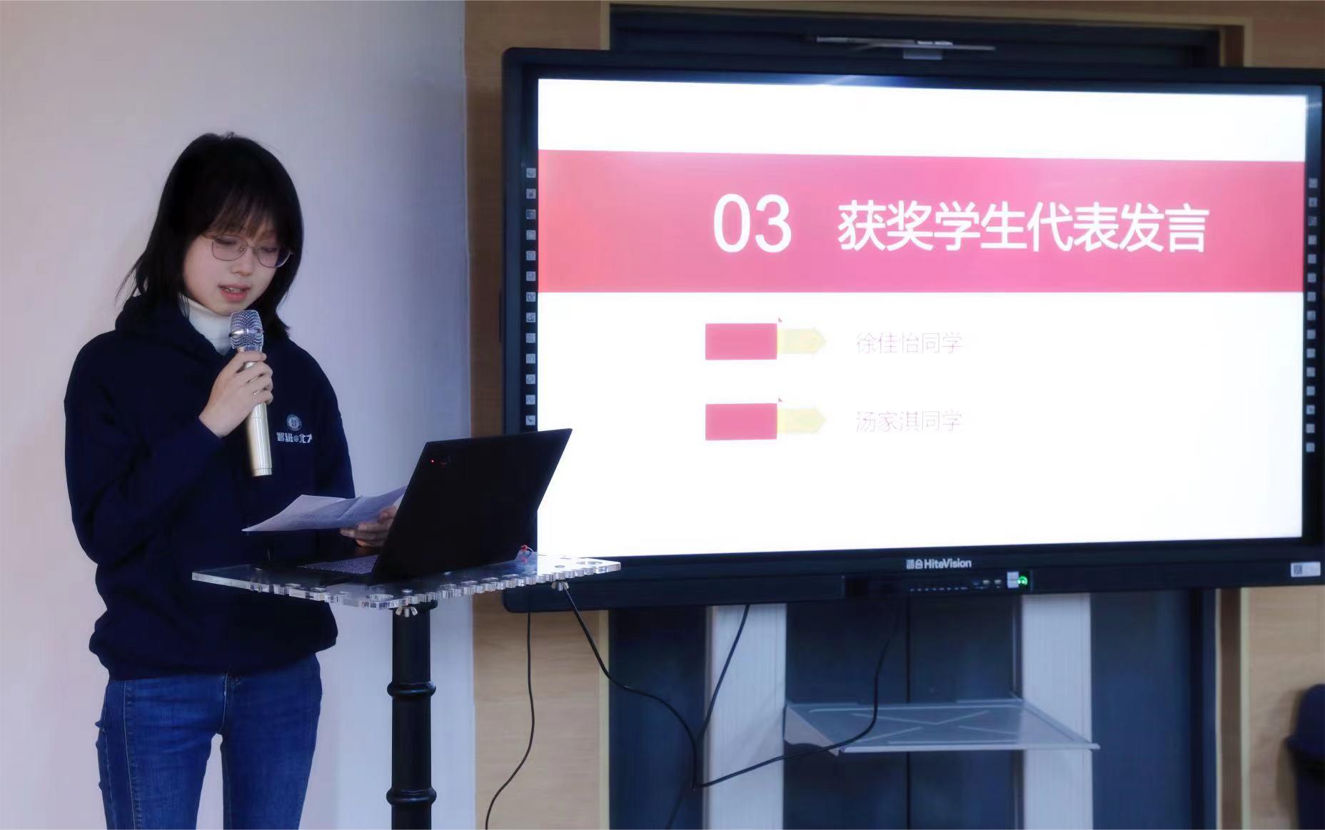 汤家淇同学深情回忆了一路走来的点点滴滴。在他的眼中,老师们人格迥异,各有风度,兢兢业业,平易近人;同学们风采动人,或担当班务,或讨论学术,或建言献策,班风严整活泼。他说,成长中难免暂时落后,差距并不可悲。不必妄自菲薄,要在科学借鉴、刻苦训练、不断钻研、主动求助的日常里找寻适合自己的节奏,稳步走好每一段路。他衷心感谢捐赠企业的热心关怀,表示将继续刻苦学习,健全人格,砥砺前行。
